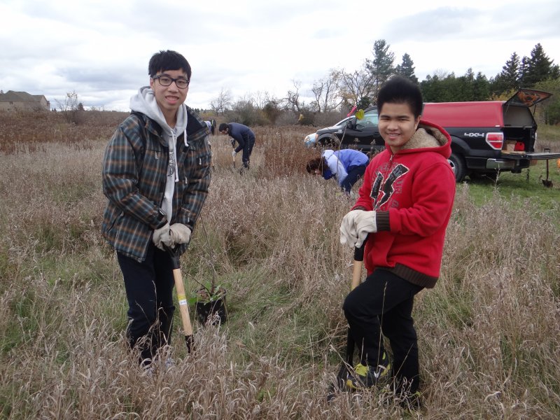 Approximately 35 students from East York Collegiate and Branksome Hall planted native trees and shrubs in Valleywood Park near Mayfield Road and Kennedy Road in Brampton. These dedicated volunteers removed invasive species (Buckthorn) that threaten the restoration project, cleaned up the site so it was free from litter, and of course they measured at least 10% of each native tree and shrub species planted to establish a baseline for future monitoring years to come.