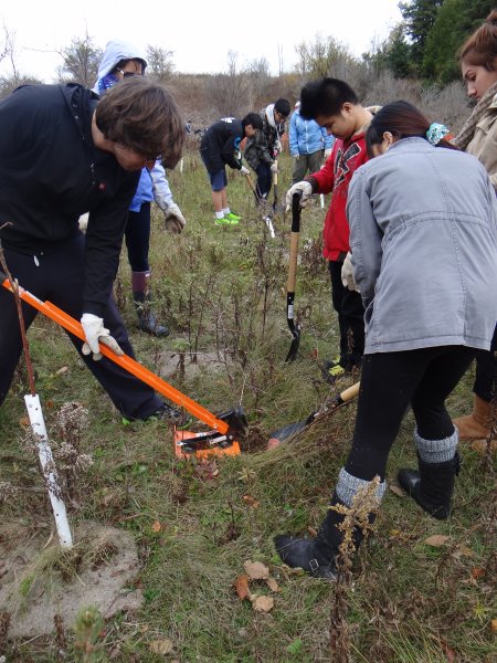 Approximately 35 students from East York Collegiate and Branksome Hall planted native trees and shrubs in Valleywood Park near Mayfield Road and Kennedy Road in Brampton. These dedicated volunteers removed invasive species (Buckthorn) that threaten the restoration project, cleaned up the site so it was free from litter, and of course they measured at least 10% of each native tree and shrub species planted to establish a baseline for future monitoring years to come.