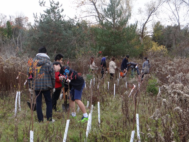 Approximately 35 students from East York Collegiate and Branksome Hall planted native trees and shrubs in Valleywood Park near Mayfield Road and Kennedy Road in Brampton. These dedicated volunteers removed invasive species (Buckthorn) that threaten the restoration project, cleaned up the site so it was free from litter, and of course they measured at least 10% of each native tree and shrub species planted to establish a baseline for future monitoring years to come.