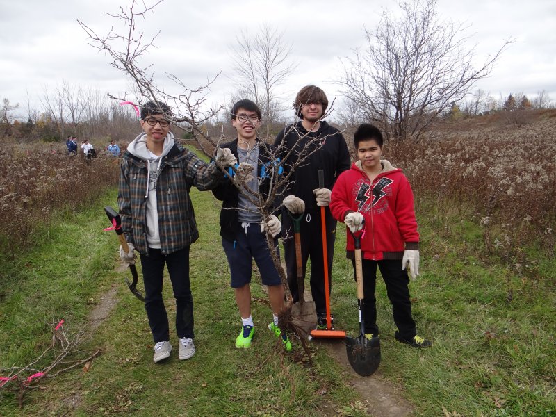 Approximately 35 students from East York Collegiate and Branksome Hall planted native trees and shrubs in Valleywood Park near Mayfield Road and Kennedy Road in Brampton. These dedicated volunteers removed invasive species (Buckthorn) that threaten the restoration project, cleaned up the site so it was free from litter, and of course they measured at least 10% of each native tree and shrub species planted to establish a baseline for future monitoring years to come.