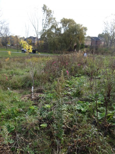 Approximately 50 people from the City of Mississauga’s Forestry staff planted 200 native trees and shrubs in Birchwood Park, a buffer zone to Birchwood Creek near Lakeshore Road West and Clarkson Road North in Mississauga. 16 youth volunteers from St. Joan of Arc Catholic Secondary School took on the next step of the program. These dedicated volunteers removed invasive species that threaten the restoration project including Phragmites australis (or common reed)  and weeds such as burdock, cleaned up the site so it was free from litter, and of course they measured at least 10% of each native tree species planted to establish a baseline for future monitoring years to come.