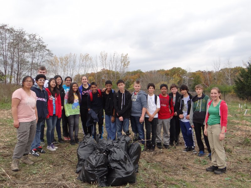 Approximately 50 people from the City of Mississauga’s Forestry staff planted 200 native trees and shrubs in Birchwood Park, a buffer zone to Birchwood Creek near Lakeshore Road West and Clarkson Road North in Mississauga. 16 youth volunteers from St. Joan of Arc Catholic Secondary School took on the next step of the program. These dedicated volunteers removed invasive species that threaten the restoration project including Phragmites australis (or common reed)  and weeds such as burdock, cleaned up the site so it was free from litter, and of course they measured at least 10% of each native tree species planted to establish a baseline for future monitoring years to come.