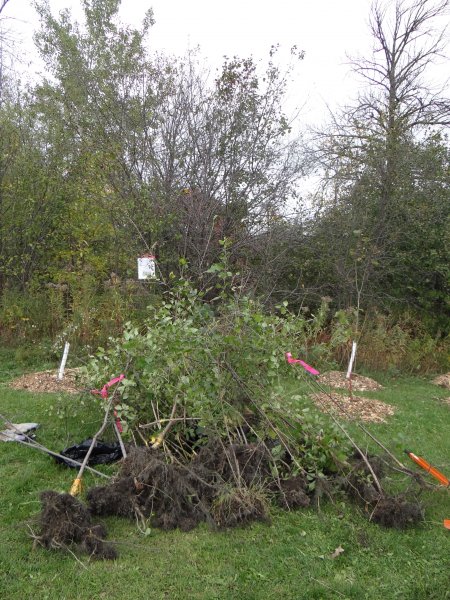 Approximately 95 adult and youth volunteers from the Mississauga Chinese Alliance Church and the Peel Environmental Youth Alliance (PEYA) came out to a community event organized by ACER, the City of Mississauga, and EcoSoure at the Iceland Arena Restoration Area, a buffer zone to Little Etobicoke Creek. The day was a great success – invasive species such as buckthorn were removed, over 200 native trees and shrubs were planted, and community members monitored at least 10% of each tree species planted to establish a baseline for future monitoring years to come.