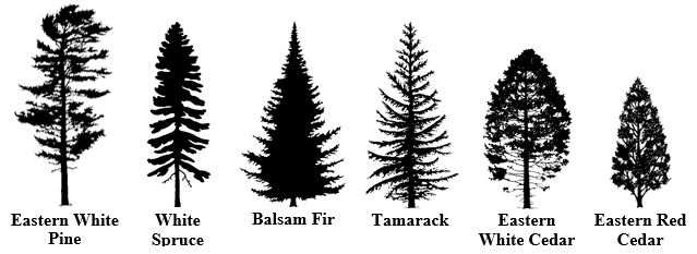 White spruce: has short 4-sided needles that roll between your fingers and have pungent odour when crushed; lower branches often droop close to the ground (fun fact: its drooping “skirt” is an excellent shelter for small animals!)